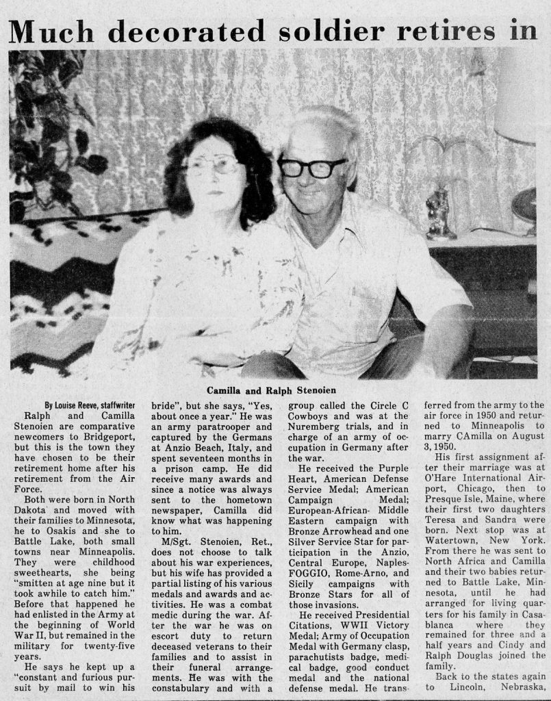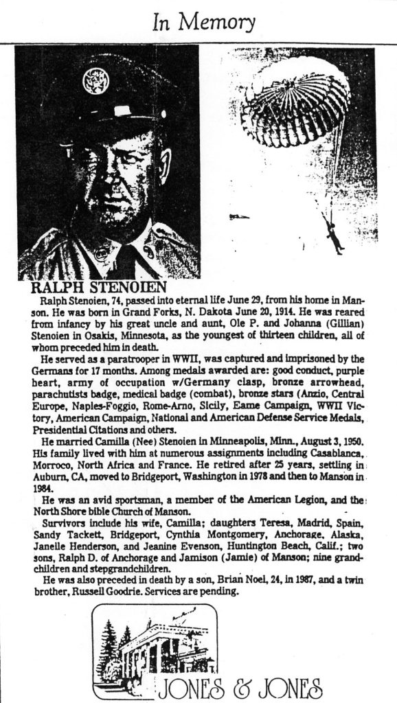 Ralph Stenoien was born to Mary Larson and Alex Goodrie on June 20, 1914 in Grand Forks, ND. Mary was left to her own to raise the twins, and it was decided that she would keep Russell Stenoien; Ole and Johanna Stenoien raised Ralph Stenoien as one their own. In the 1941 census, Ralph, Russell and Mary are listed as living together in the Minneapolis directory.